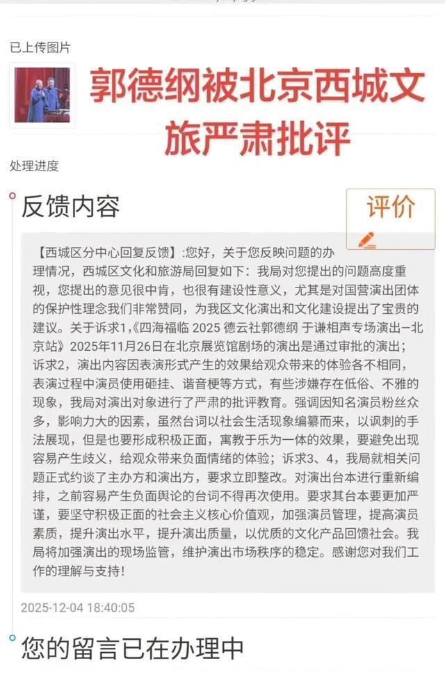 这位观众的举报很快得到了有关方面的回复,准确的说有关方面认可了观众的举报。 郭德纲在相声的地位实际上不亚于赵本山在二人转的地位。 曾经赵本山一己之力让二人转摆脱了三俗成功转型绿色二人转。 让二人转走出了东北三省,最起码二人转再也没有被质疑过三俗。 曾经在三俗问题上,传统相声输给了郭德纲,随着社会进步,相声中的屎尿屁终究会被淘汰的。 但是相声的核心还是讽刺,传统相声当初正是因为没有讽刺全是吹捧,才被抛弃的,相声是时候改变了!
