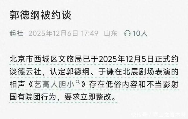 网友更关心的是郭德纲被约谈的原因,根据通告,郭德纲和于谦表演的相声艺高人胆小存在低俗内容和不当影射国有院团的行为,要求立即整改。 相声在北方的受众比较多,尤其天津是相声的起源之地。 相声表演很早就登上了春节联欢晚会,尤其是八十年代诞生了很多耳熟能详的相声作品。 马季的宇宙牌香烟,五官争功,还有姜昆的虎口遐想都是非常成熟的相声作品,而且还是讽刺相声代表作。 郭德纲火起来之后,开始带着徒弟上节目,不仅郭德纲火了,徒弟也跟着火了。 记得当初郭德纲的徒弟上节目表演的相声,总会有人评价没有剧场表演的好,其实说白了,他们在电视节目表演的相声都是在剧场表演的阉割版本。 阉割的正是不能在电视节目上说的那些话。 曾经东北三省的二人转也有这个问题,记得我小的时候,还能看到二人转的光盘。 那时候的二人转光盘,现在来看尺度很大,不仅是尺度很大,当时的二人转光盘现在是根本没办法销售的。 赵本山也发现了这个问题,赵本山提出了绿色二人转的概念,才让二人转走出了东北三省。 相声也有这个问题,尤其是郭德纲最早火起来的时候,相声有一场雅俗之争。 郭德纲还创作出了反三俗,最后的结果当然是郭德纲赢了。 相声俗到底俗在哪里呢,就三个字屎尿屁,相声的梗离不开这三个字。 郭德纲被约谈的原因当中影射这个词很值得玩味,影射说白了不直说,但是看到的又能完全了解说的什么。 郭德纲和于谦到底在相声表演中说了什么呢,原因还真被网友找到了