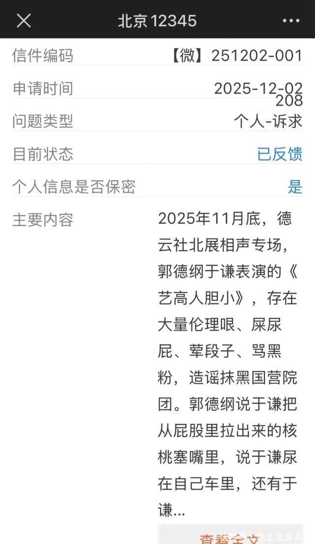 这应该是一位现场观看郭德纲相声表演的观众,看完表演之后,就把郭德纲和于谦的相声举报了。